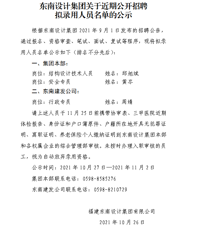 東南設計集團關于近期公開招聘 擬錄用人員名單的公示